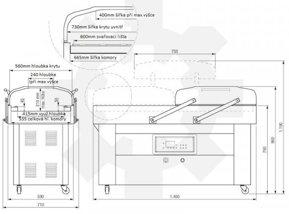 Snadno ovladatelná balička v nerezovém provedení, která má dvě komory a překlápěcí kryt. V průběhu vakuovacího procesu může být připraven k vakuování další obal, u malých sáčků lze vakuovat několik sáčků najednou. Stroj má digitální panel s 50 programy, 2 svařovací lišty (přední a zadní), 8 mm široký a až 60 cm dlouhý svár s kódováním, automatické otevírání víka. Na displeji jsou dostupné jazyky angličtina, němčina a čeština. Stroj má přípojku pro plyn, která může ale nemusí být použita. Vakuovací stroj je vhodný pro potraviny, maso, léky a další citlivé zboží, které by mělo být chráněno před vzduchem.