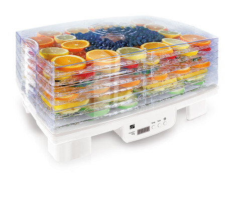 Usazení ventilátoru, výborně řešená sušící plata a navíc možnost jejich výškového nastavení garantuje rovnoměrné a rychlé sušení. Materiál sušících plat vám zase dopřeje jednoduché vyndání usušeného ovoce i zeleniny. Suroviny k platům nepřilnou, snadno je proto oddělíte.