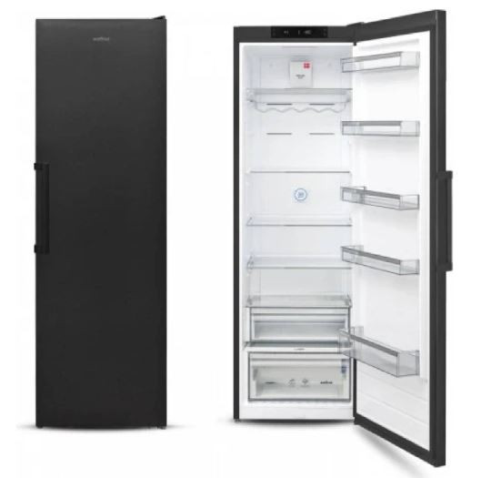 Volně stojící monoklimatická jednodveřová chladnička, Barva tmavý nerez, Energetická třída E, Roční spotřeba energie: 121 kWh/rok, Objem chladící části 390 l, Natural iontech, NoFrost, Hlučnost 40 dB, Rozměry spotřebiče (VxŠxH): 186 cm x 59,5 cm x 65 cm