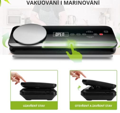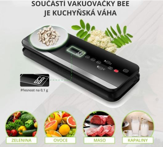 Externí domácí vakuová balička BEE 2v1 s vestavěnou kuchyňskou váhou a funkcí marinování. Váhu lze odejmout a uschovat ze spodní strany vakuovačky. Možnost nastavení vlhkosti potravin i rychlosti vakuování. Délka svařovací lišty 30 cm. Kompaktní a skladná varianta pro domácí vakuování.