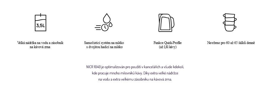 V práci vše funguje v plné rychlosti – kromě kávy? Náš NICR 1040 tento problém snadno vyřeší. Snadno se ovládá a čistí, v kombinaci s extra velkou nádobou na zrnkovou kávu a velkou nádrží na vodu, je ideální pro každou kancelář.