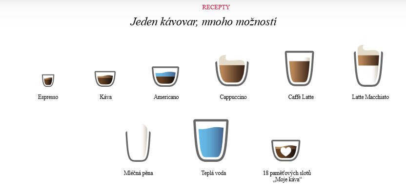 | CHUŤ | Systém předohřevu Aroma Balance System (3 profily) Cappuccino-Connaisseur Nastavitelná síla kávy (5 stupňů) Nastavitelný stupeň mletí Nastavitelná teplota kávy (3 stupně) |