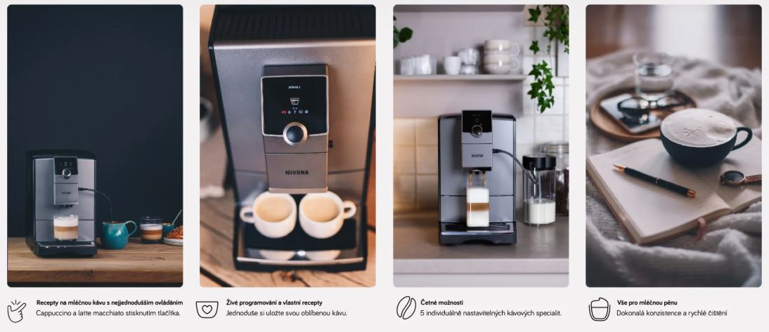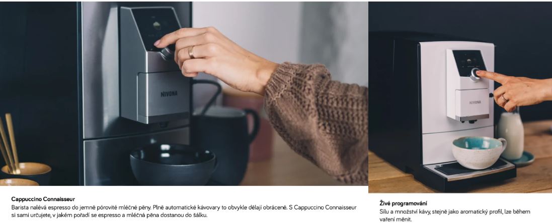 Cappuccino pouhým stisknutím tlačítka. Jednoduché, rychlé a nyní v novém designu. Nová řada plně automatických kávovarů Nivona 7 představuje nové modely z vysoce kvalitních materiálů v kombinaci s propracovanou estetikou, určených hlavně pro milovníky cappucina a latte macchiato. V těchto plně automatických strojích nyní kromě systému Aroma Balance pracují také znalci cappuccina(Cappucino Connaisseur). Cappuccino tak chutné, že ho chcete obejmout.