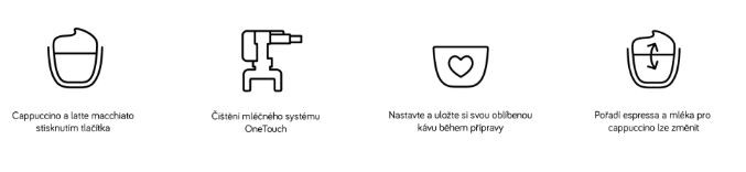 | ÚDRŽBA | Vyjímatelná varná jednotka pro dokonalou hygienu Funkce oplachování pro OneTouch SPUMATORE Snadno čistitelný mléčný systém Filtr vody CLARIS součástí balení Kontrolka výměny filtru Program automatické péče o odvápnění a čištění |
