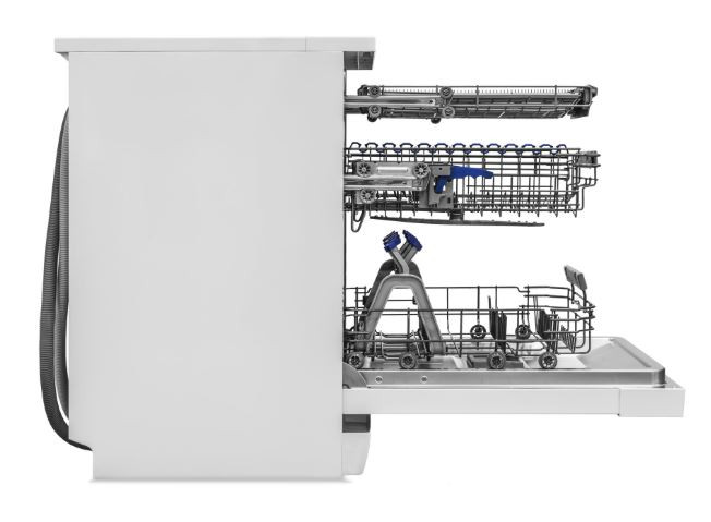 Myčka zvládne najednou 10 jídelních sad. Je vnitřně uspořádána tak, aby se každý kousek nádobí dokonale umyl a vysušil. Nádobí můžete vkládat do tří úrovní, přičemž jedna z nich je určena především na příbory. Ty kolem sebe budou mít spoustu místa a voda i čisticí prostředek se k nim jednoduše dostane. Horní koš je výškově nastavitelný a to i při plném naplnění a je tedy možné rychle zvýšit prostor nad spodním košem pro objemnější nádobí.