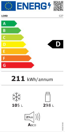 LORD C27 využívá ekologické chladivo R600a (isobutan), které je šetrné k životnímu prostředí. Spotřebič je navíc zařazen do energetické třídy D s roční spotřebou energie pouhých 211 kWh, což potvrzuje jeho vysokou energetickou účinnost.