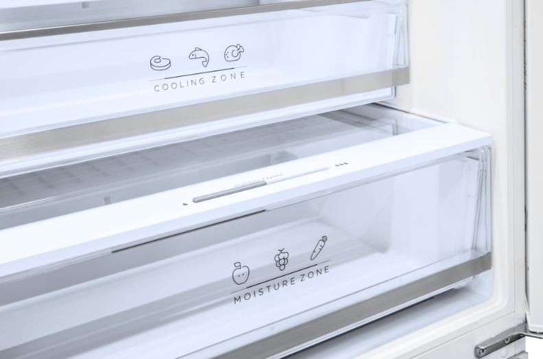 Chladicí část je vybavena čtyřmi policemi z bezpečnostního skla, přičemž tři z nich jsou výškově nastavitelné, což zajišťuje maximální flexibilitu při uspořádání potravin. Kromě toho je součástí výbavy zásuvka s teplotou 0 °C, ideální pro skladování masa a ryb, a zásuvka na ovoce a zeleninu s regulací vlhkosti, která udrží vaše produkty déle čerstvé.