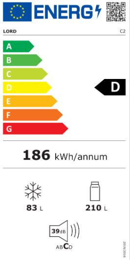 Volně stojící chladnička LORD C2 v bílé barvě se se svou spotřebou 186 kWh za rok řadí do úsporné energetické třídy D.