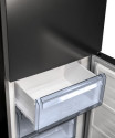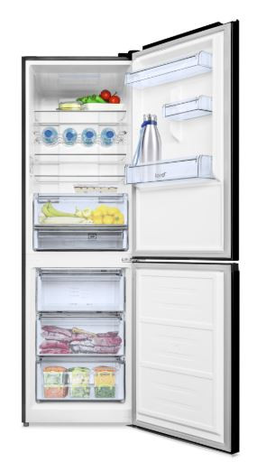 Kombinovaná chladnička, Výška: 185 cm, Spotřeba el. energie: 127 kWh/rok, Objem celkem: 323 l, Objem chladicí části: 219 l, Objem mrazící části: 104 l, Hlučnost: 39 dB(A) re 1 pW, Klimatická třida: SN-T (+10°C až +43°C), Automatické odmrazování NoFrost, BLDC invertor kompresor, Integrovaná madla, Barva dveří: černý nerezový vzhled, Barva boků: černá