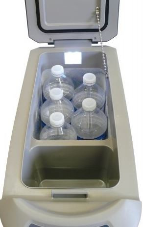 Napájení je z 12 nebo 24V, volba napětí probíhá automaticky. Vnitřní prostor je osvětlen LED diodami, ovládanými elektromagnetickým spínačem, rozsvítí se po otevření dveří. Vnitřek je rozdělen tradičně na dva prostory, větší pro hluboké chlazení či mrazení (d/š/v: 26,5x17,5x32,5 cm, + vybrání na jednu vyšší lahev až 35,5cm) , druhý menší prostor pro uložení potravin citlivějších na nižší teploty (d/š/v: 17x11,5x18 cm).