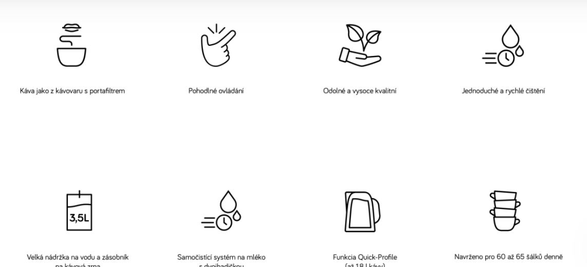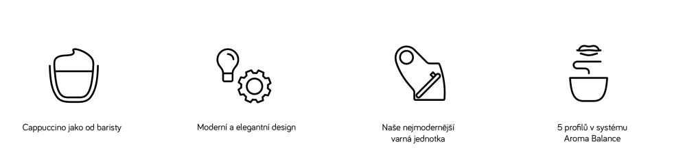 | KOMFORT | „Moje káva“ lze uložit 9 receptů Živé programování Výrobní nastavení receptů lze změnit Dvoubarevné osvětlení šálků OneTouch-SPUMATORE DUOplus (pro cappuccino a spol.) Funkce 2 šálků na cappuccino atp. Funkce 2 šálků na espresso/kávu Přihrádka na porci mleté kávy Funkce horké vody na čaj (3 úrovně) Rychlý profil |