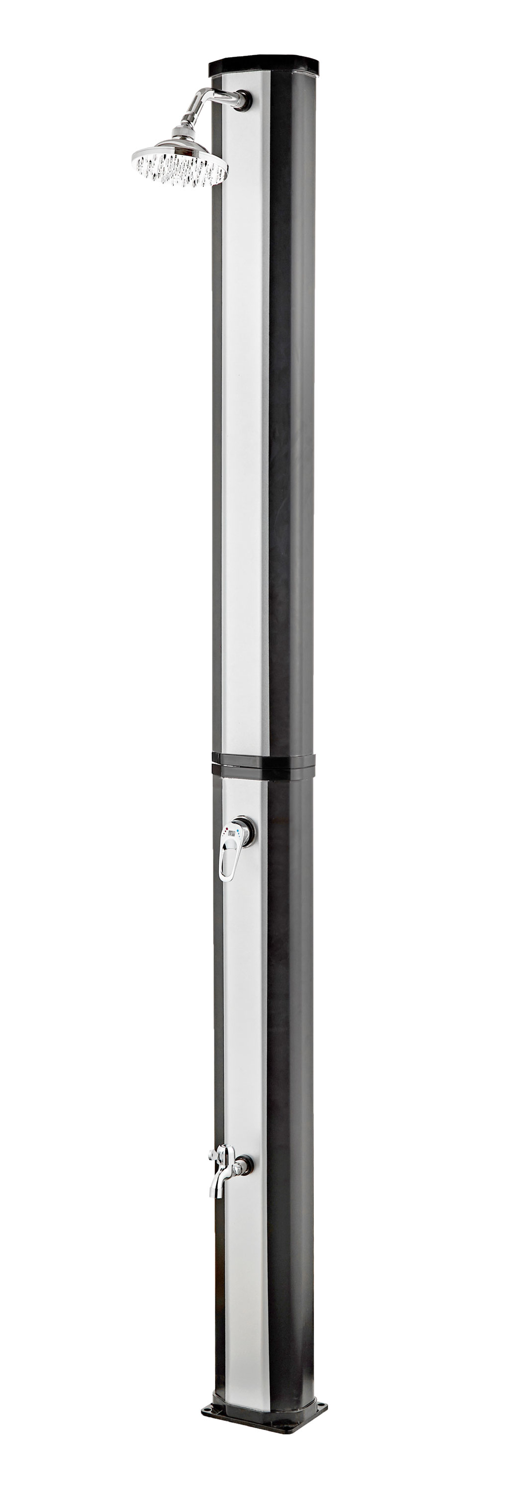 Tělo sprchy v elegantní černo stříbrné barvě slouží zároveň jako solární kolektor. Absorbuje sluneční paprsky a ohřívá vodu bez potřeby elektřiny nebo plynu. Sprcha před koupáním navíc pomáhá udržet vodu v bazénu čistší a snižuje množství nečistot, které by se jinak dostaly do bazénu.