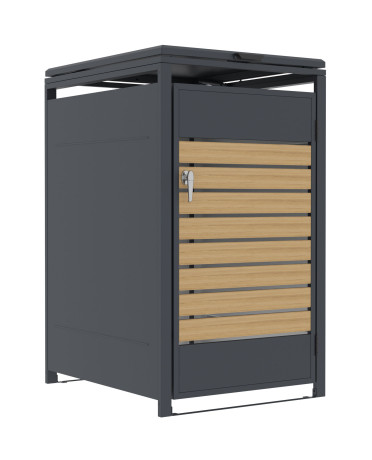 Kombinace moderní antracitové barvy a dekoru dřeva vytváří vizuálně atraktivní celek, který skvěle doplní moderní novostavbu i tradiční venkovský dům. Díky kompaktním rozměrům se vejde i do menších prostor u vchodu nebo podél plotu. S pomocí přístřešku elegantně schováte nevzhledné plastové nádoby na odpad a přispějete tak k celkovému upavenému vzhledu celého okolí domu.