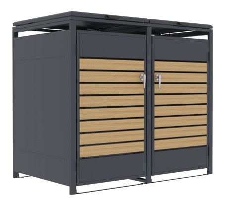 Kombinace moderní antracitové barvy a dekoru dřeva vytváří vizuálně atraktivní celek, který skvěle doplní moderní novostavbu i tradiční venkovský dům. Díky kompaktním rozměrům se vejde i do menších prostor u vchodu nebo podél plotu. S pomocí přístřešku elegantně schováte nevzhledné plastové nádoby na odpad a přispějete tak k celkovému upavenému vzhledu celého okolí domu.